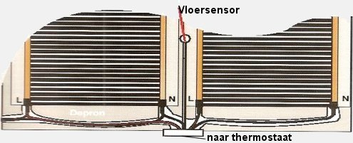 Als alle banen op hun plaats liggen dient de vloersensor nog aangesloten te worden op de thermostaat. Vanuit de thermostaat leidt u het snoer van de vloersensor naar beneden en plaatst deze onder de verwarmde delen tussen twee verwarmingsbanen, op zodanige wijze, dat deze sensor de temperatuur van de vloer kan meten. Hierbij geldt ook, dat er geen contact mag zijn met de verwarmde delen van de folie. (zie ook instructies m.b.t. de aansluiting van de thermostaat)