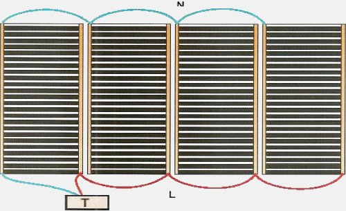 Hier worden de banen doorgelust van baan tot baan. Hierbij bestaat het risico dat bij een eventueel slechte verbinding een baan uitvalt. Hierdoor zal de hele vloer uitvallen. Wij adviseren dus om alle banen afzonderlijk naar een aansluitdoos te leiden en vandaar 2 aansluitdraden naar de thermostaat te brengen.